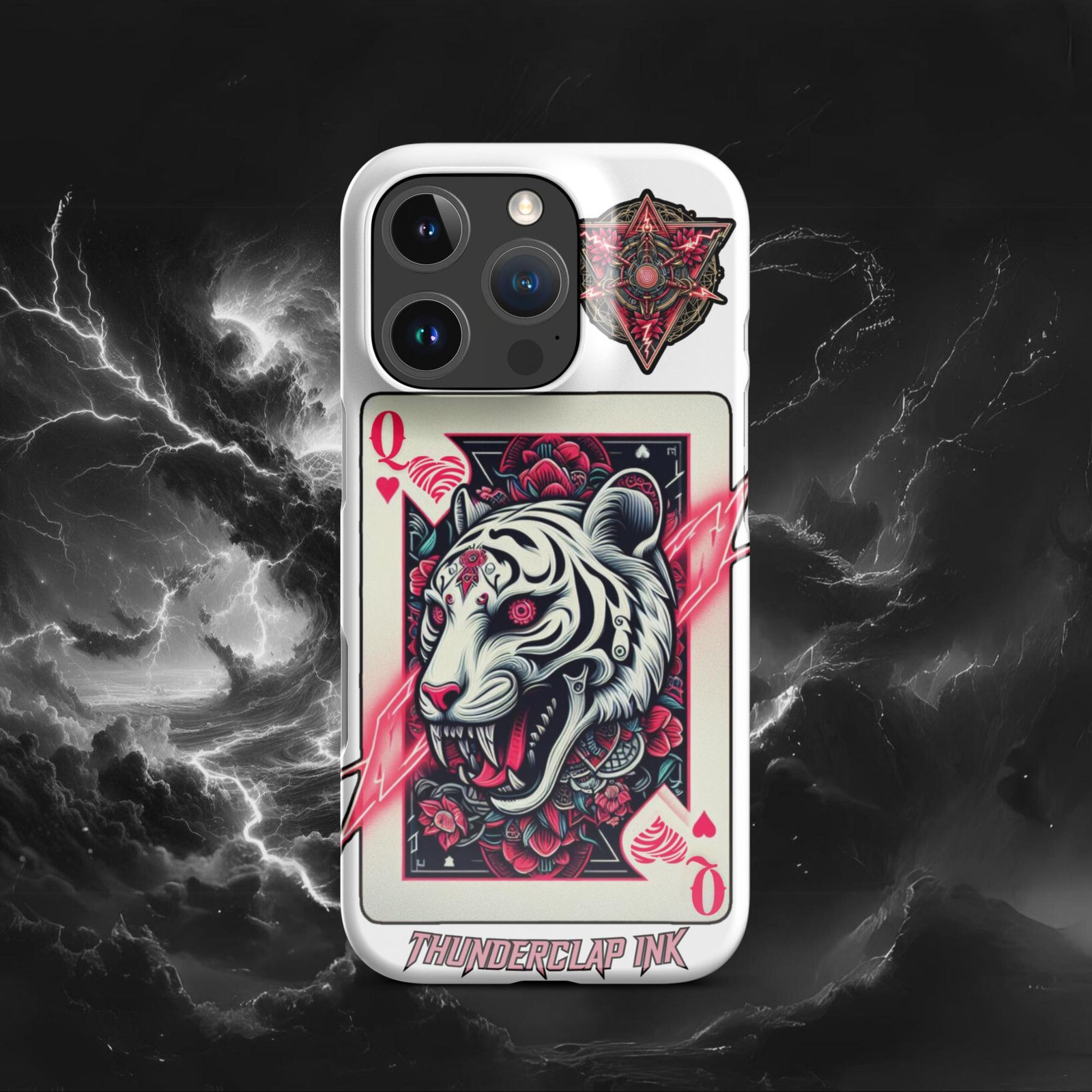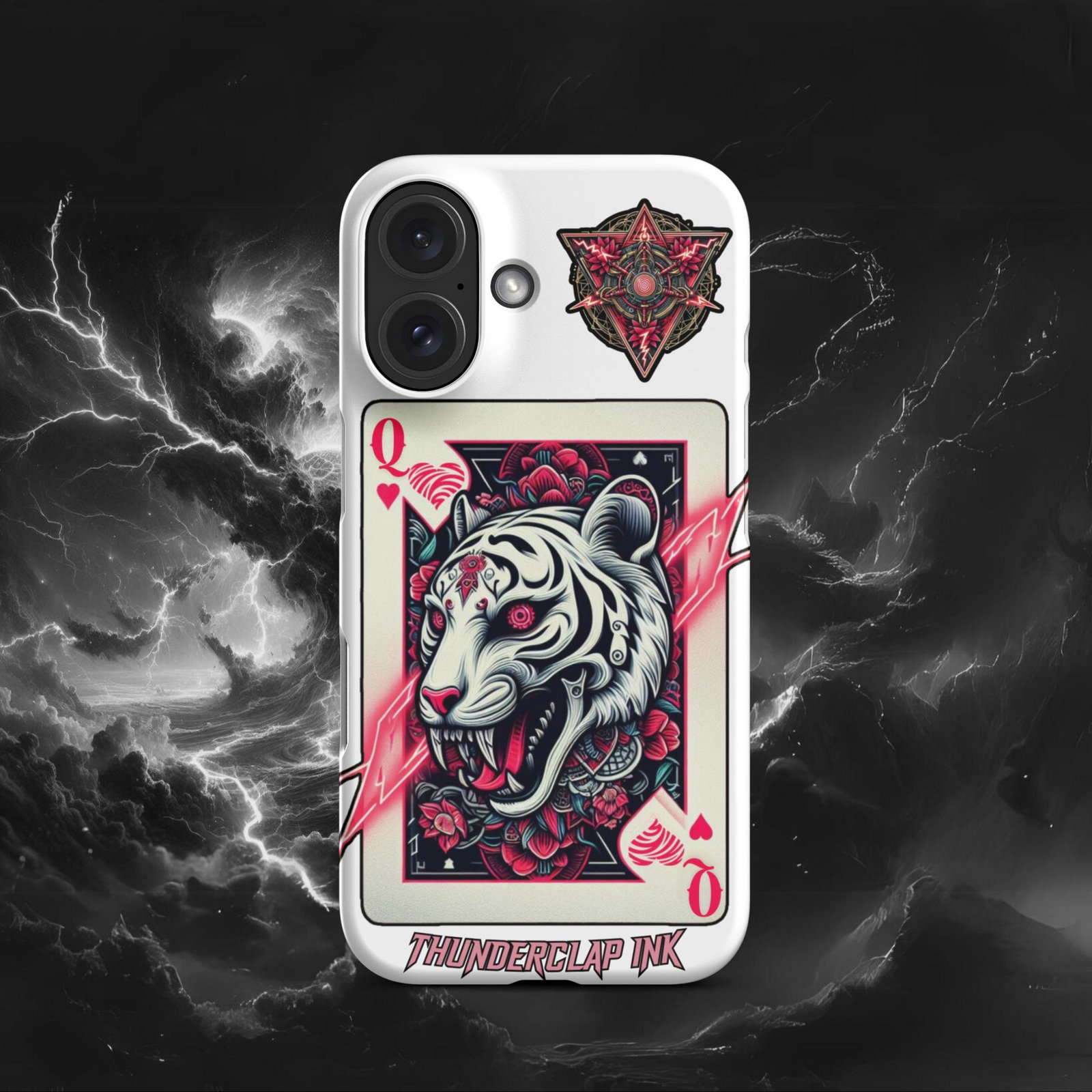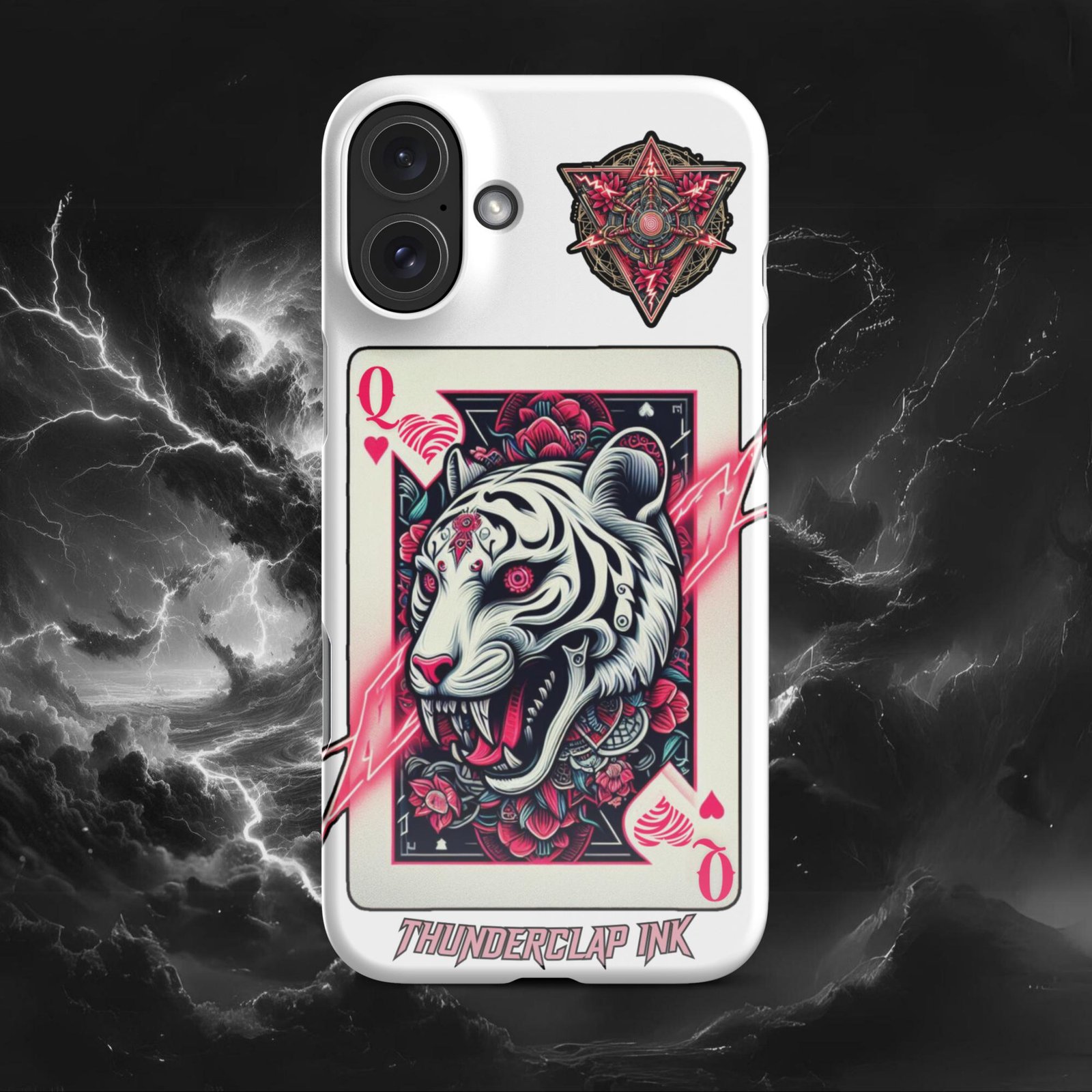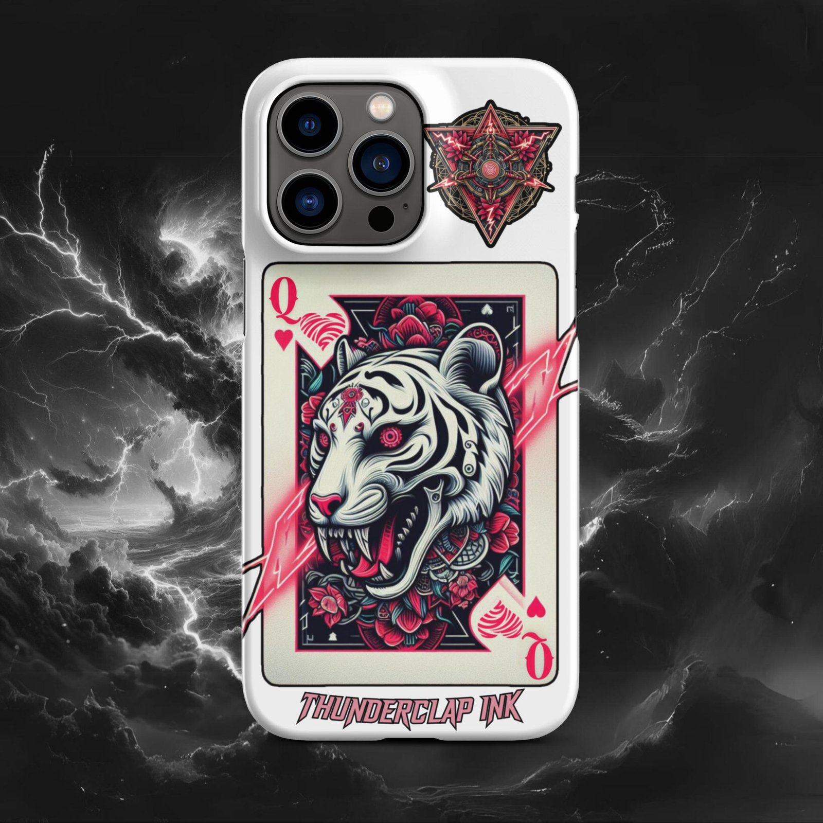 Embrace elegance and strength with our Queen of Hearts Tigress iPhone Snap case. Featuring a majestic Tigress in a Queen of Hearts card adorned with lotus flowers, this tattoo-style art piece is perfect for those who appreciate minimalist yet powerful designs.